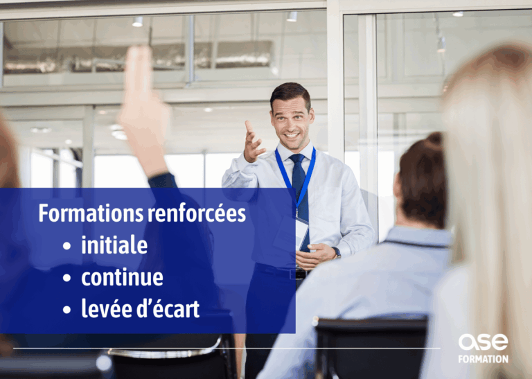 ASE Formation digitalise l’ensemble de ces formations, nous vous proposons une offre blended (mixte avec un formateur et e-learning) et bientôt 100% en e-learning, pour plus de réactivité et d’autonomie et parfaitement adaptées à vos besoins. Elles comprennent les nouveautés, mais aussi parfaitement individualisée puisque répondant aux écarts survenus lors de la réalisation du cas test.